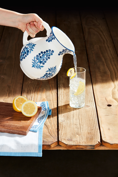 Blue Block Print Pitcher. This exquisite hand-stamped stoneware pitcher features a captivating blue block print design, adding a touch of elegance to any table setting. The hand-painted rim enhances its artisanal charm, showcasing the craftsmanship involved in its creation. With a generous capacity of 72 oz, it is perfect for serving your favorite beverages, whether it's refreshing iced tea, fresh lemonade, or chilled water. Made from durable stoneware, this pitcher is not only a functional piece but also a beautiful decorative item that complements both modern and traditional decor styles. Ideal for entertaining guests or for everyday use, it brings a unique and artistic flair to your dining experience.