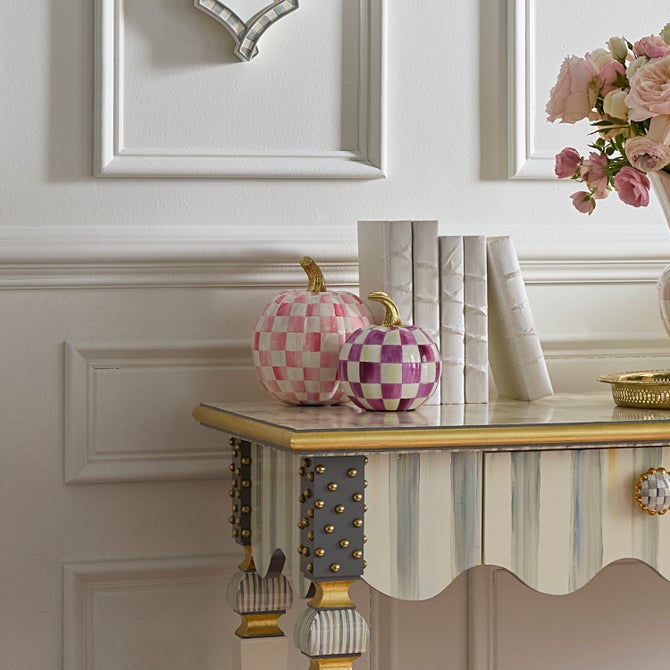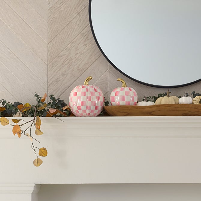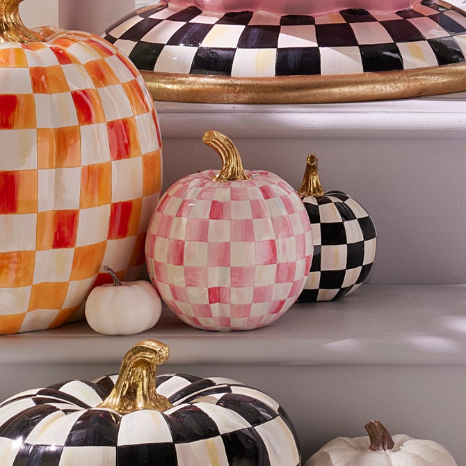 Take your pick from our most unusual pumpkin patch with this small pumpkin, featuring hand-painted pink checks and topped with a gold leaf stem.