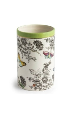 Hold everything from pencils to posies with this short ceramic vase, featuring a pattern of butterfly toile that highlights the butterflies and bees with a pop of color. It’s trimmed with a band of pistachio and gold lustre.