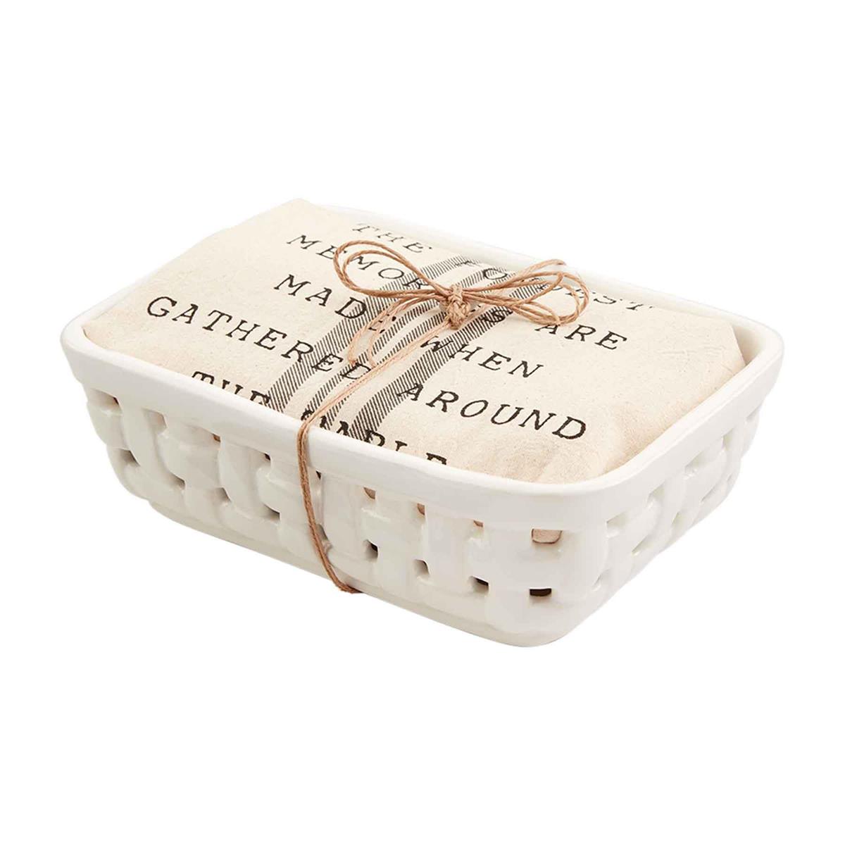 Make found memories with our Ceramic Basket and Towel Set. The two piece set comes with a woven ceramic basket. The basket comes with a flour sack hand towel. The towel reads "The fondest memories are made when gathered around the table". The set is perfect for dinner rolls.