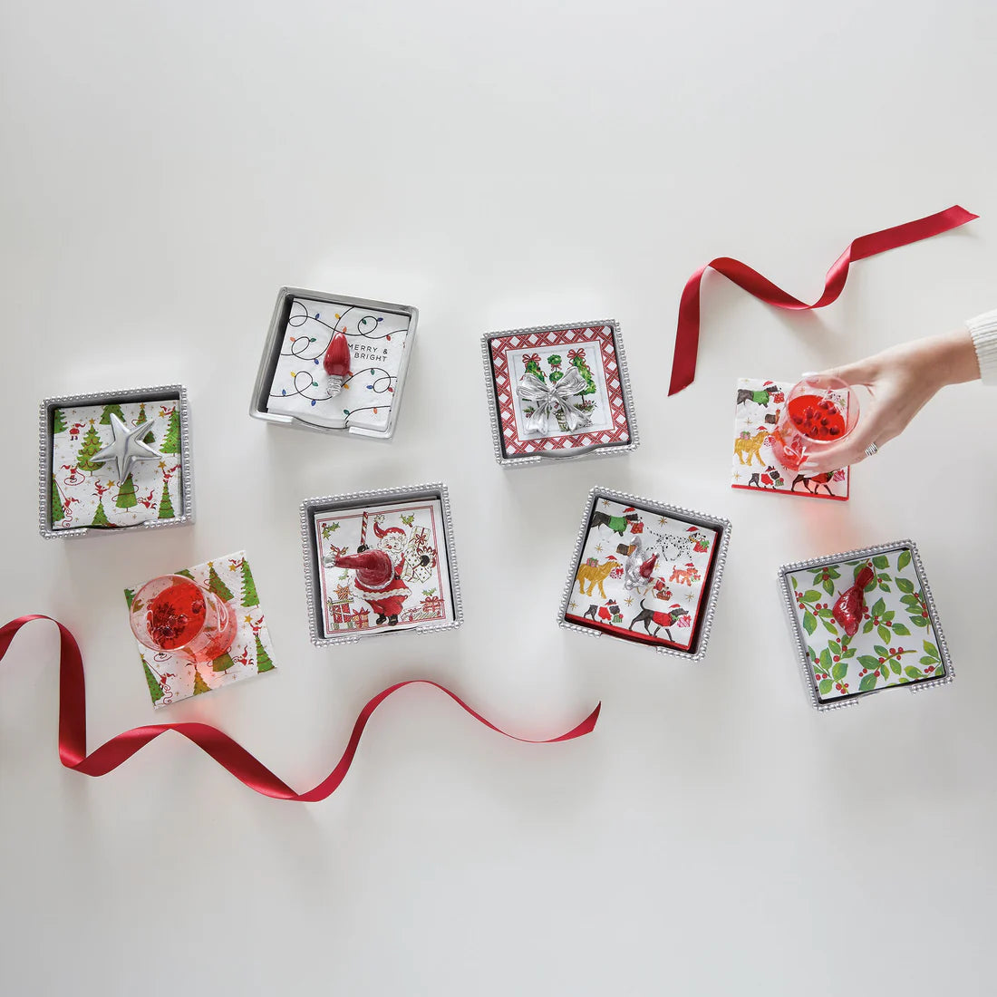 Bring festive elegance to your holiday table with our Christmas Topiary Bow Beaded Napkin Box Set. Featuring a beautifully detailed bow-shaped napkin weight and a stack of charming topiary-themed cocktail napkins, this set is perfect for seasonal entertaining. Handcrafted from 100% recycled aluminum.