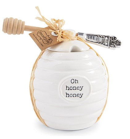 Ceramic Honey pot features Hive like exterior design, resist "Oh Honey Honey" sentiment and ceramic lid with handle