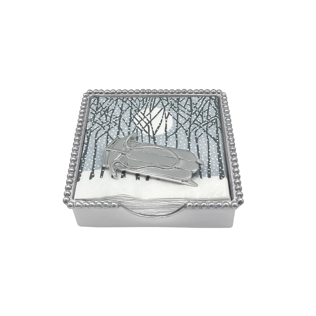 Add a touch of winter whimsy to your tabletop with our Double Runner Sled Beaded Napkin Box Set. This charming set includes a winter-themed cocktail napkin and a handcrafted aluminum napkin weight shaped like a classic double runner sled. Perfect for holiday hosting or as a seasonal gift, it brings cozy, nostalgic cheer to every gathering. Handcrafted from 100% recycled aluminum.