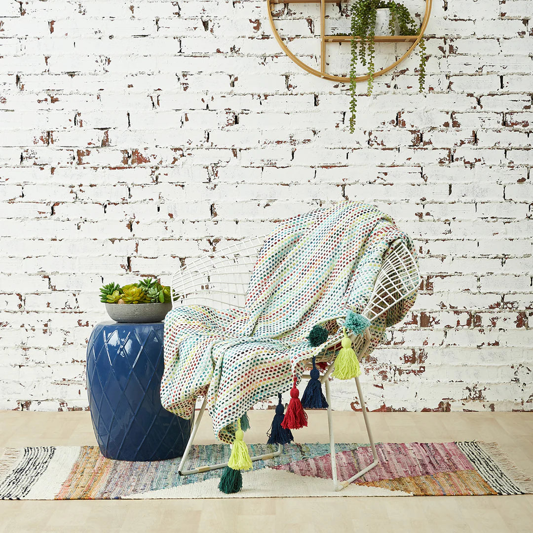 Feel like the true unicorn that you are wrapped up in this full spectrum rainbow throw. Pair it with the matching decorative pillow. At carol & frank we believe different is beautiful. Each piece in the Ella collection is individually woven and knotted by hand with quality materials, which means no two are exactly alike. Color variations and slight irregularities in pattern are not mistakes, but part of what makes this collection unique.