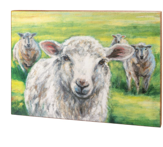 A wooden box sign depicting a flock of friendly sheep in a field and natural wood sides for added interest. Design is replicated from original artwork painted onto burlap canvas, giving the art a unique depth and texture. Our Friendly Sheep box sign is easy to hang or can free-stand alone.