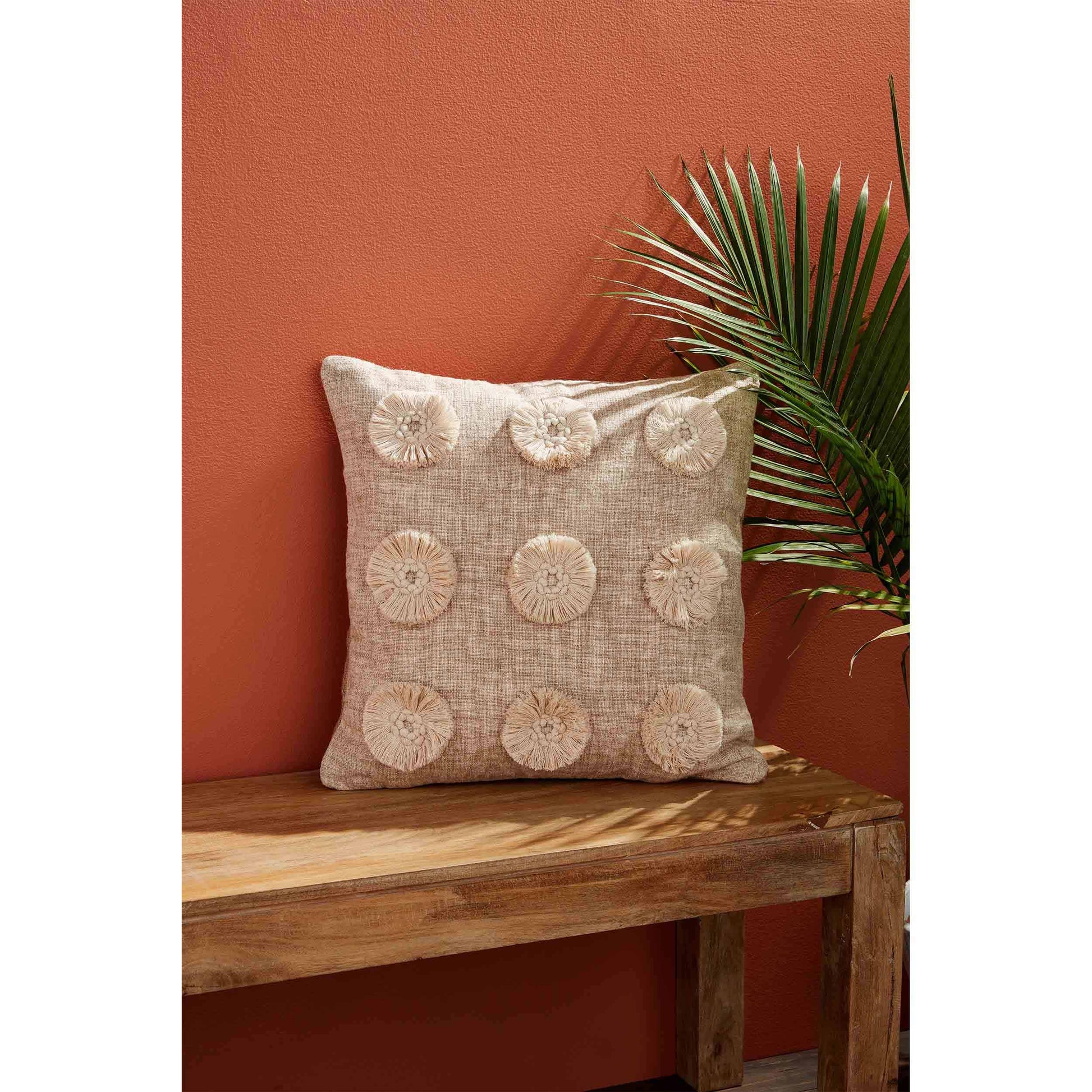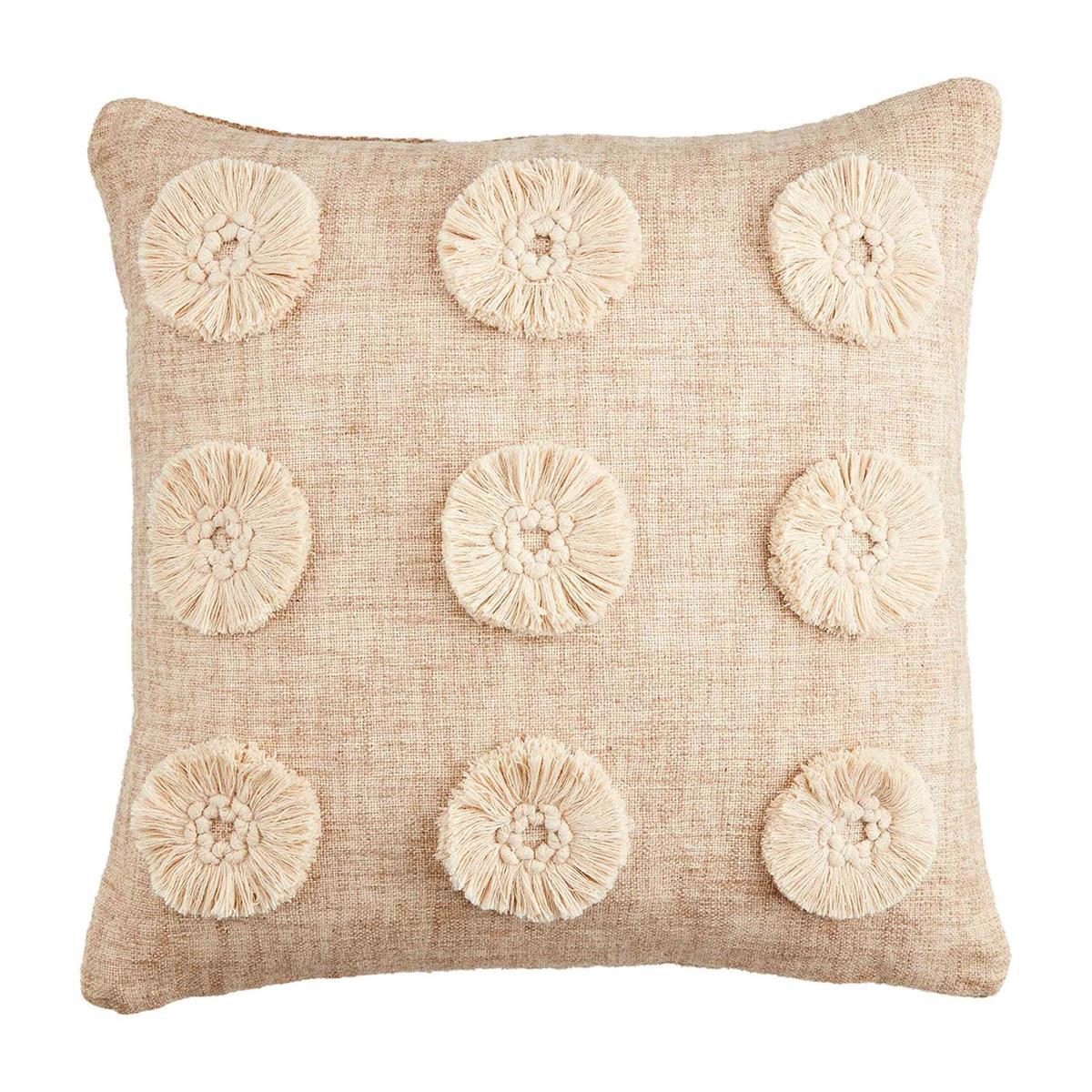 This Fringe Dot Throw Pillow features an impressive design. The fringe dot applique cotton pillow features a jute backing. The pillow has a zipper closure. The pillow arrives with an insert that is vacuum-sealed and located inside the pillow cover. The entire product arrives vacuum sealed for shipping and storage ease.