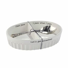 2-piece set. Two-sectioned ceramic dish with debossed sentiments holds classic or sweet potatoes. Arrives with silverplate sentiment spoon.