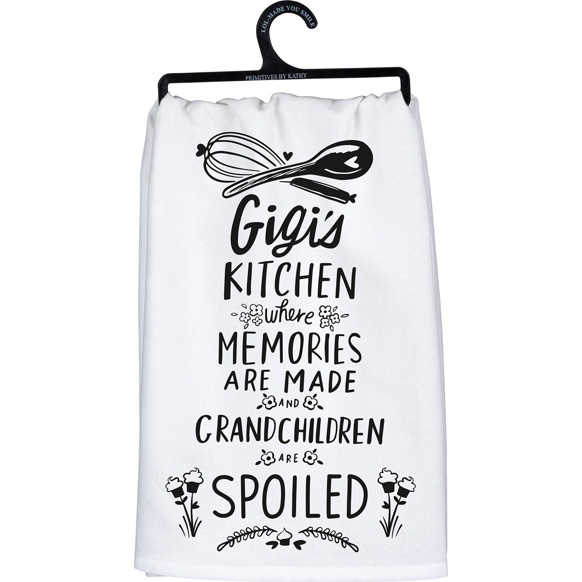 A black and white cotton kitchen towel featuring "Gigi's Kitchen Where Memories Are Made And Grandchildren Are Spoiled" sentiment with whisk and spoon and floral designs. Machine-washable.
