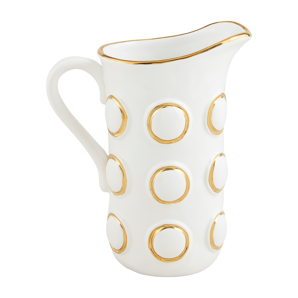 The Gold Ring Bead Pitcher is a stunning piece of tableware that will add a touch of elegance to any dining or entertaining space. This mottled ceramic pitcher features raised beads with an electroplated gold finish, giving it a luxurious and sophisticated look. With a capacity of __ oz, it is perfect for serving water, juice, or other beverages at your next gathering. The high-quality dolomite construction ensures durability and longevity, making it a practical and stylish addition to your home. Whether used for everyday meals or special occasions, this pitcher is sure to impress with its unique design and eye-catching details.