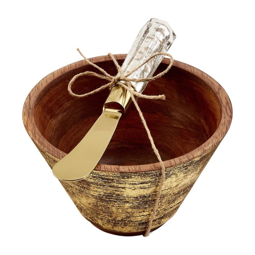 Say hello to your new favorite dip bowl, our gold wood dip bowl set. The two piece set comes with a foiled mango wood dip bowl. The dip bowl features a gold metallic distressed finish and unique markings. The dip bowl comes with a coordinating mercury glass spreader.
