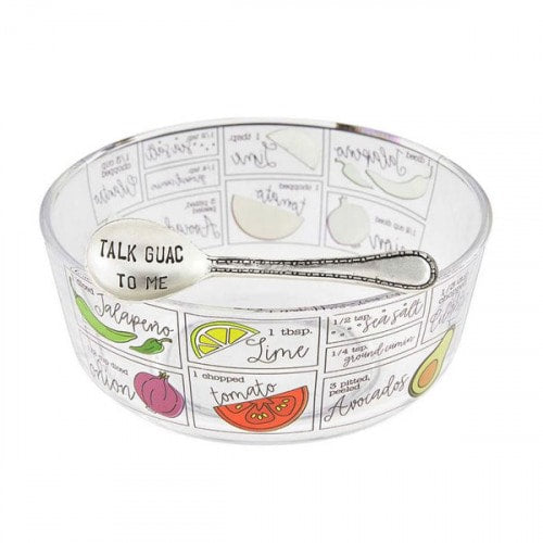 Talk Guac to me with this Guac Recipe Dip Bowl Set. The two piece set comes with a glass dip bowl with recipe exterior. The exterior features measurements for avocados, tomatoes, onions and more. The dip bowl comes with a stamped silver-plate spoon that reads "Talk Guac to me".