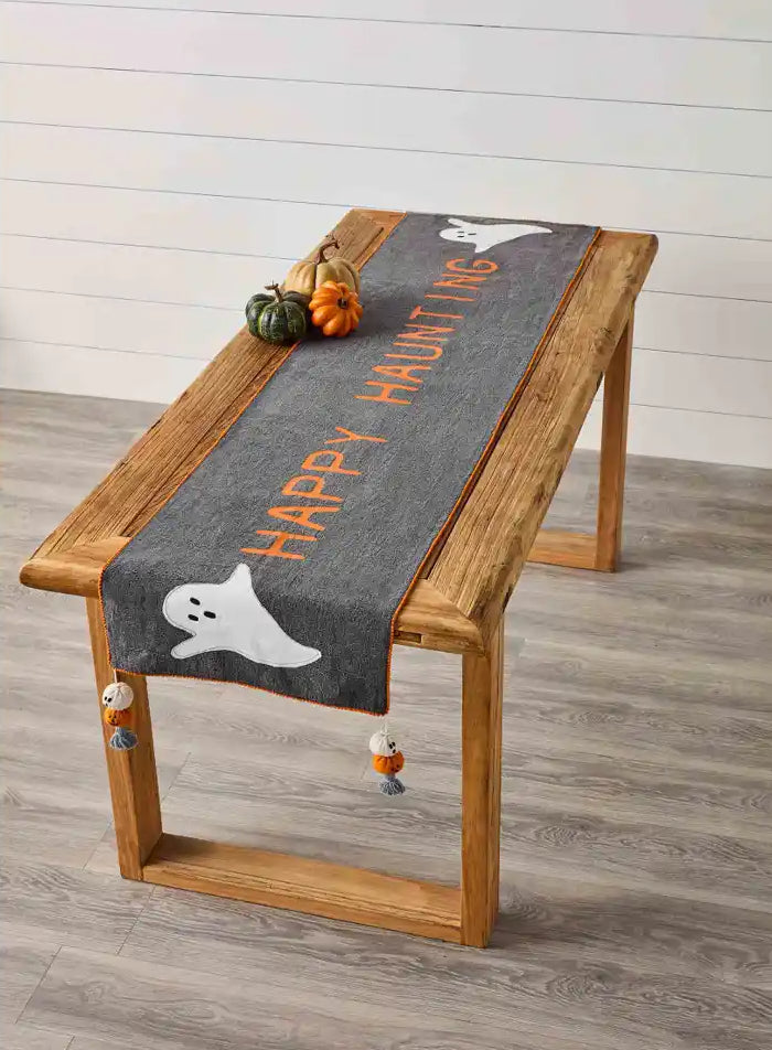 Crafted from high-quality washed canvas, this table runner showcases intricate appliqued details that will add a touch of spookiness to your home decor. Featuring a stylish pom and tassel corner trim, this runner boasts a sleek black color that effortlessly complements any Halloween theme. The captivating sentiment "Happy Haunting" in vibrant orange steals the spotlight at the center, while charming ghost details adorn each end. Measuring 18" x 72", this table runner is made from 100% cotton for durability and easy maintenance. For cleaning, simply spot clean to keep it looking its best.