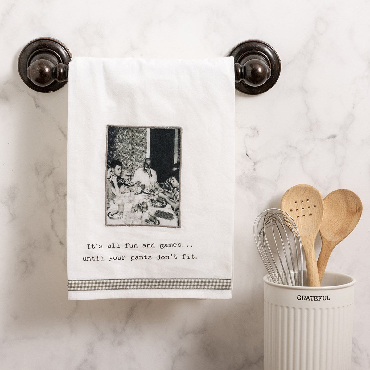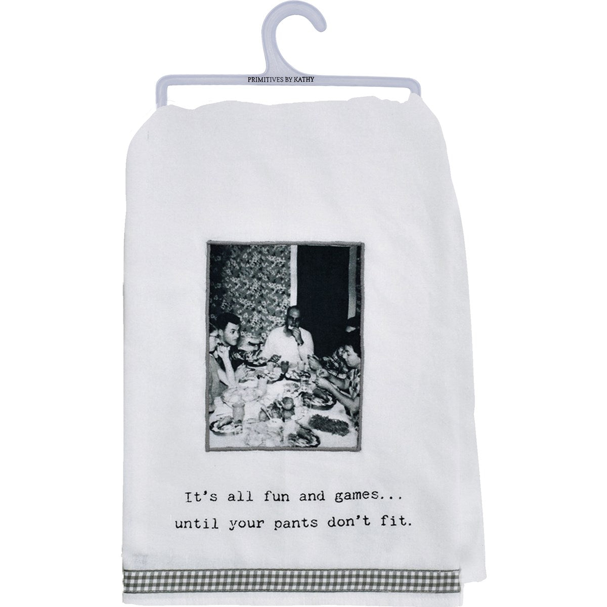 A cotton kitchen towel from our Trash Talk by Annie Collection features a stitched art panel featuring a vintage photograph, "It's All Fun And Games...Until Your Pants Don't Fit" sentiment, and gingham ribbon trim. Our Fun And Games kitchen towel is machine-washable.