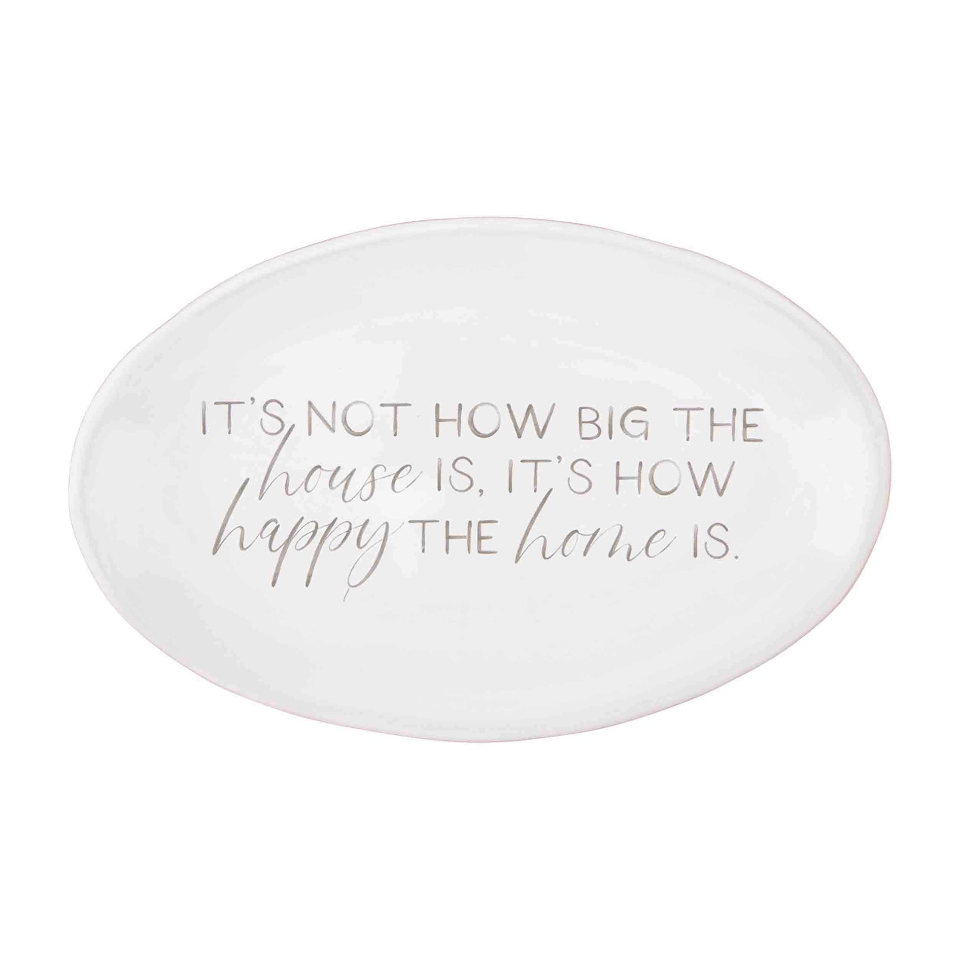Spend time surrounded by good people and good food with our It's Not Happy Sentiment Tray. The glazed terracotta tray features an oval shape. The center of the platter features the sentiment: It's not how big the house is, it's how happy the home is in a script gray font.