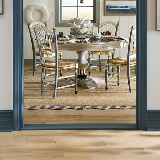 This 8' x 10' woven rug features a center of sustainable jute, bordered by a scalloped edge of black and white wool stripes. So versatile, it’s perfect for any room.