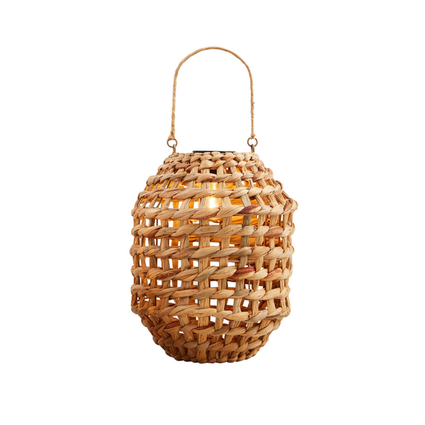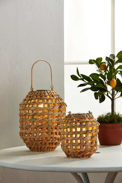 The Large Light-Up Woven Mini Lantern is a beautifully crafted decorative piece that combines natural materials with modern functionality. Made from intricately woven water hyacinth, this lantern adds a touch of rustic elegance to any space. Its compact size, measuring 12 inches in height and 9 1/2 inches in diameter, makes it a versatile addition to both indoor and outdoor settings. The lantern features a battery-operated light bulb that emits a warm, inviting glow, perfect for creating a cozy ambiance. Whether placed on a patio, in a living room, or as a centerpiece on a dining table, this lantern enhances the atmosphere with its charming design and gentle illumination.