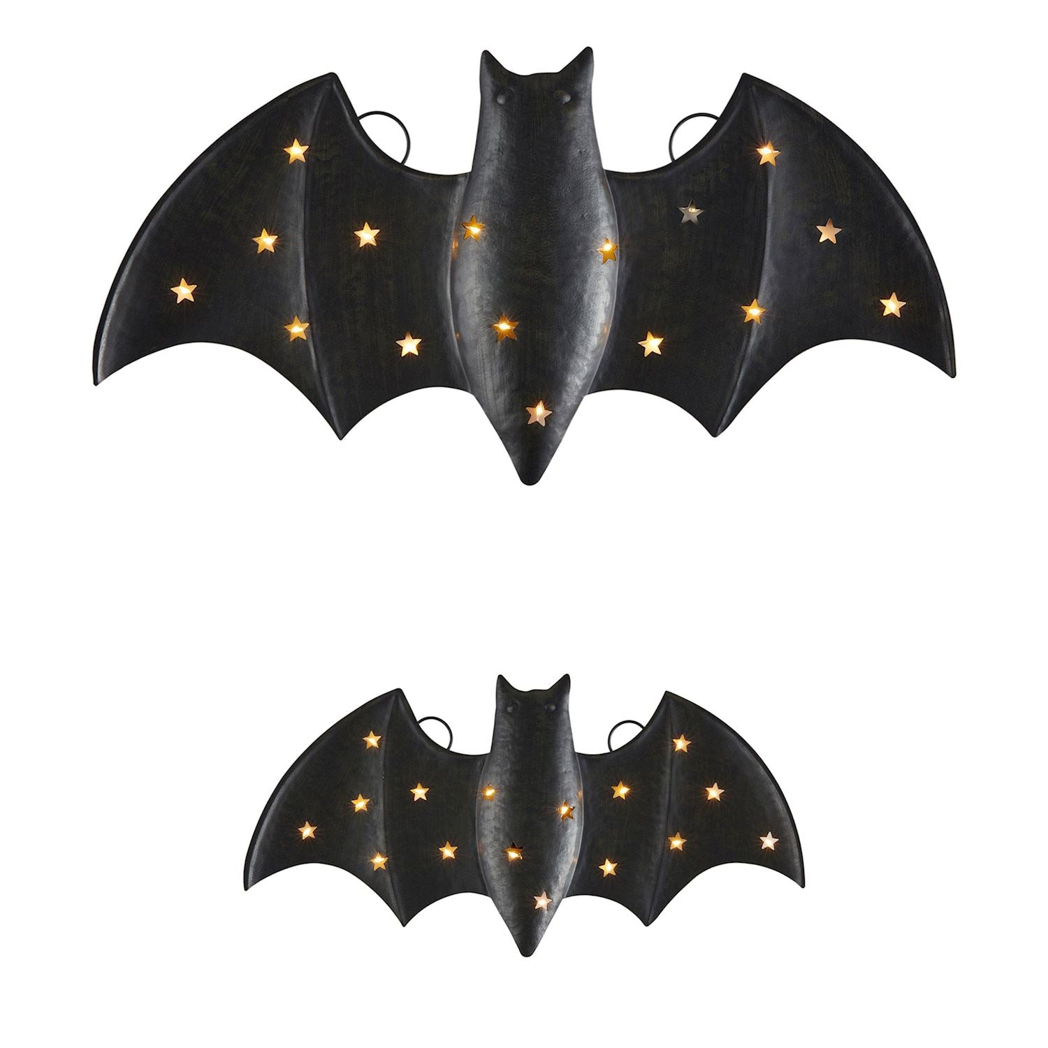 Hand-painted tin bat features LED light-up cut-out star detail. Requires 2 AAA batteries, not included.