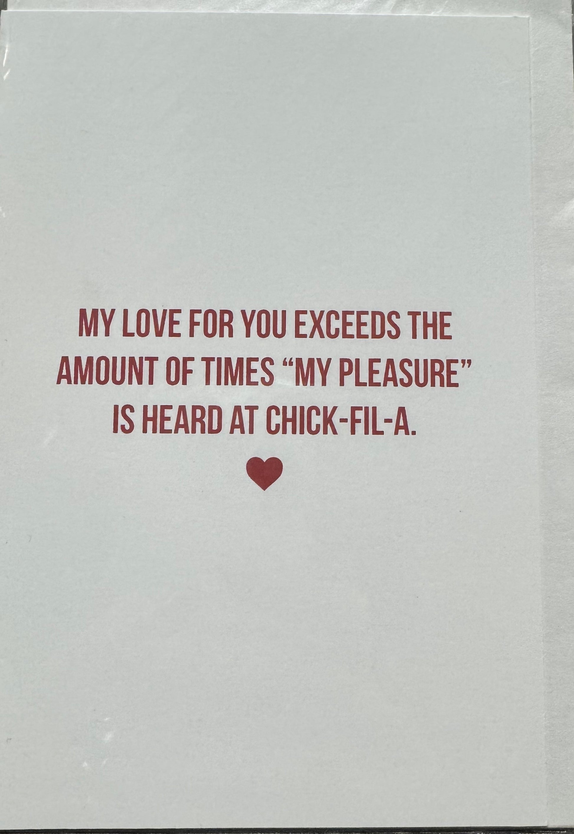 Spread joy with our "Love For You" card that delivers more warmth than your favorite chicken sandwich! This playful greeting card brings smiles and heartfelt messages together in one delightful package. Perfect for expressing affection to friends, family, or that special someone who appreciates a dash of humor with their heartfelt sentiments.