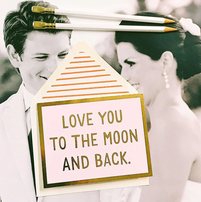 Our shimmering gold foil print card with matching pink striped envelope is blank on the inside for your handwritten expression of love. When you love them that much, send a love note with some dazzle.
