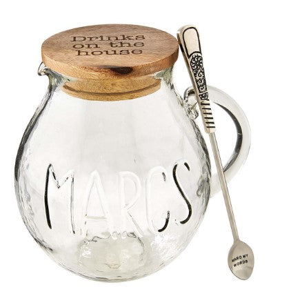 Glass pitcher is embossed with the word "MARGS" and arrives with an etched mango wood lid that reads "DRINKS ON THE HOUSE.