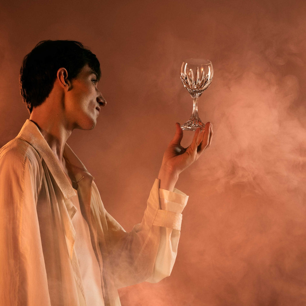 The Massena glass showcases Baccarat’s meticulous craftsmanship. Deep orgue bevel cuts are etched directly into the Clear crystal, radiating from the foot of the glass to the base of the wide bowl. This, in turn, puts the smoothness of the upper bowl in sharp relief. The intricate detailing gives the Massena glass the appearance of impressive heft, as if it were a modern-day chalice. The polished silhouette and prismatic qualities make it worthy of any festive occasion or special soirée. The glass is just one component of the iconic Massena bar and tableware collection, which encompasses wine glasses, highball glasses, tumblers, and a decanter. All pieces from the Massena collection share a scrupulously textural quality.