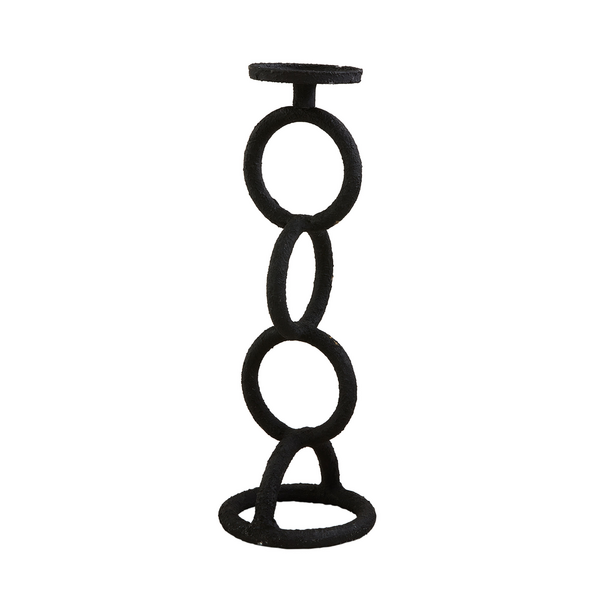 This iron candlestick showcases a chain link design and is crafted from durable iron material. Its medium size allows for easy integration into any decor style, making it a versatile addition to any space. Suitable for both indoor and outdoor use, this candlestick can hold a standard-sized candle. Whether placed as a centerpiece on a dining table or used as a decorative accent on a mantel, it is guaranteed to elevate the ambiance of any room.