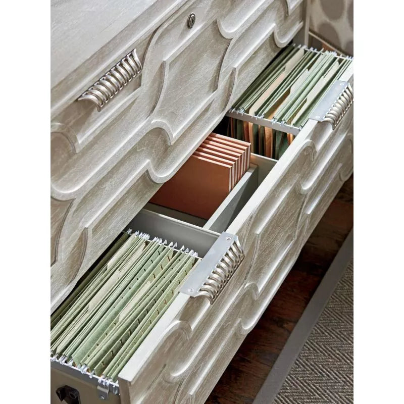 pattern of contemporary fretwork on two full-extension file drawers that accommodate both letter and legal sizes. There are removable storage trays in both drawers. Metal ferrules at the base are finished in brushed nickel to complement the collection? pearl gray finish.