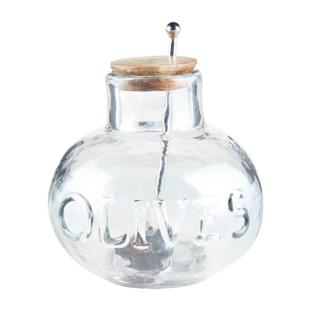 2-piece set. Embossed glass olive jar with wood lid. Comes with stainless steel slotted spoon.