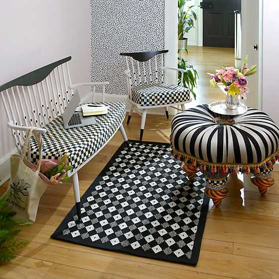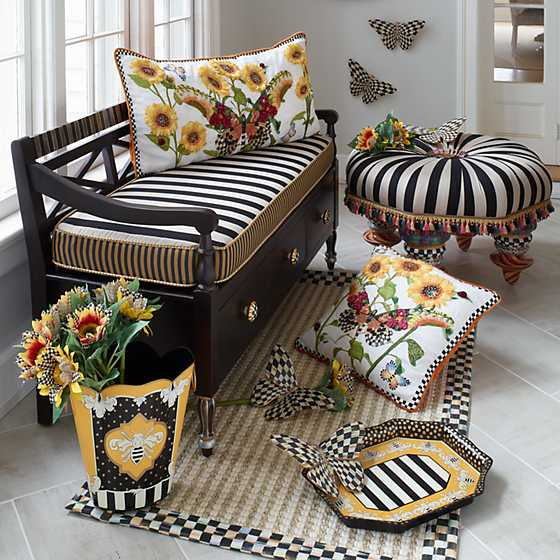 As you would expect, our On Wall Street Setting Seat is sharp dresser, indeed. This handsome piece is a smart investment, in classic black-and-beige cotton-blend striped satin jacquard, with an iridescent purple-and-green moiré pleated ruff, a button covered with Gordonstown tartan, and an accent of tasseled fringe. Setting seats are as delightful in a family room as in a formal parlor. Enjoy luxuriously comfortable cushions in sumptuous fabrics and four handmade, hand-glazed majolica legs, hand-painted by our artisans with stripes, signature checks, ceramic floral transfers, and gold lustre embellishments. Each has its own personality, but all offer gorgeous versatility-be it stylish and sumptuous guest seating or a sunning spot for a spoiled Siamese. Add a glass top (not included) for a one-of-a-kind coffee table.