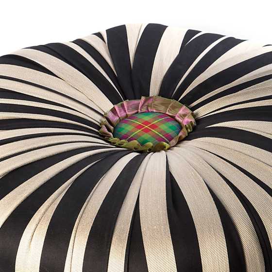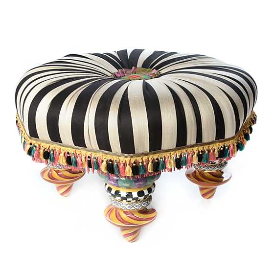 Cotton-blend stripe satin jacquard, iridescent purple/green moire pleated ruff, Gordonstown-tartan-covered button, tassel fringe, and handmade and decorated majolica feet with gold lustre embellishments. Pieces may vary due to the handmade nature of each product.