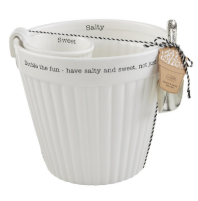 Double the fun with our popcorn and candy bowl set. The three piece set comes with a ceramic popcorn tub. The tub features the phrase "Double the fun - have and sweet, not just one". The interior reads "Salty". The set also comes with small detachable candy dish that reads "Sweet". We've also included a silver-plate scoop that reads "What's Poppin".