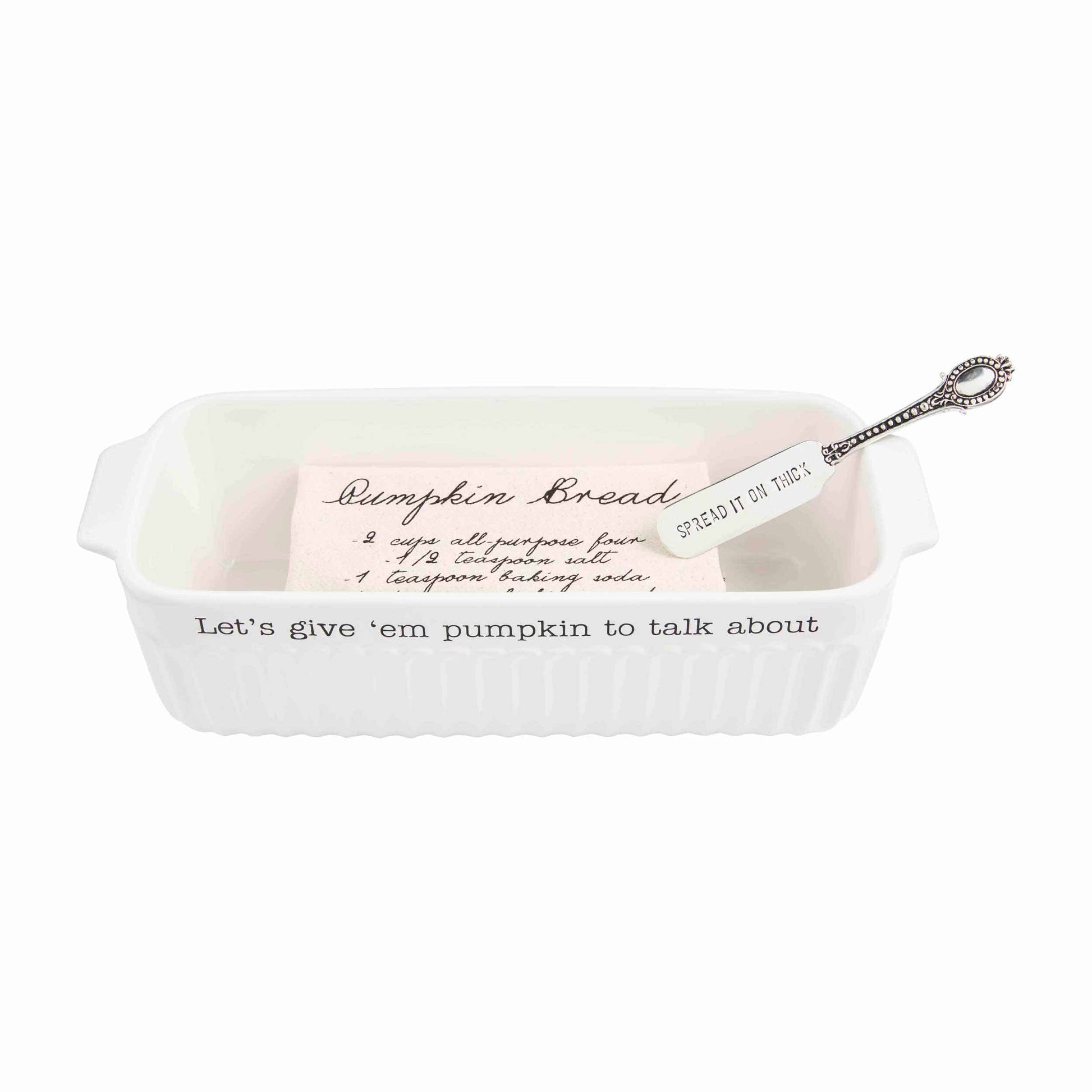 Let's give 'em pumpkin to talk about with our Pumpkin Bread Baker and Towel Set. The three piece set comes with a fluted ceramic baking dish. The dish comes with a stamped silver-plate spreader and cotton recipe towel for Pumpkin Bread. The dish reads "Let's give 'em pumpkin to talk about".