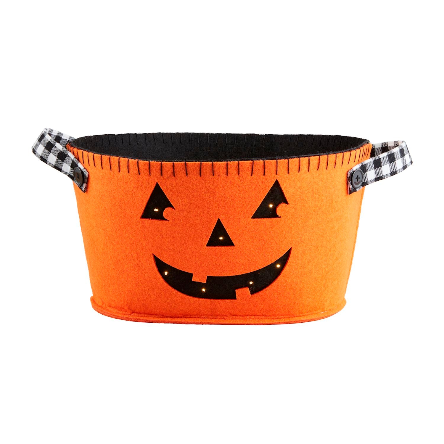 The Reversible Ghost & Jack-O-Lantern Bucket is the perfect accessory for trick-or-treating or Halloween parties. This unique candy bucket is made of durable felt and features a reversible design, allowing you to switch between a spooky ghost and a grinning jack-o-lantern. The mesh facial features add a fun and eerie touch, while the LED light-up detail adds an extra element of excitement. Measuring 7" x 12" in diameter, this bucket is spacious enough to hold plenty of candy and treats. Get ready to collect candy in style with this Reversible Ghost & Jack-O-Lantern Bucket!