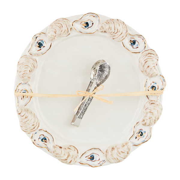 Round Oyster Platter Set. This exquisite 2-piece set is perfect for seafood enthusiasts and elegant dining experiences. The stoneware platter features a beautifully crafted layered stoneware oyster shell rim, adding a touch of coastal charm to your table setting. Accompanying the platter are stainless steel oyster tongs, designed for easy handling and serving. The platter measures 12 inches in diameter, providing ample space for your favorite oysters and seafood delicacies, while the tongs are 5 1/2 inches long, ensuring a comfortable grip. Made from durable stoneware, this set is both stylish and functional, making it an ideal addition to any kitchen or dining collection.