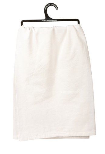 A blue and white cotton kitchen towel lending a "A Salty Pirate Lives Here… With His Beautiful Mermaid" sentiment with mermaid, pirate, ship, and sea designs. Machine-washable.