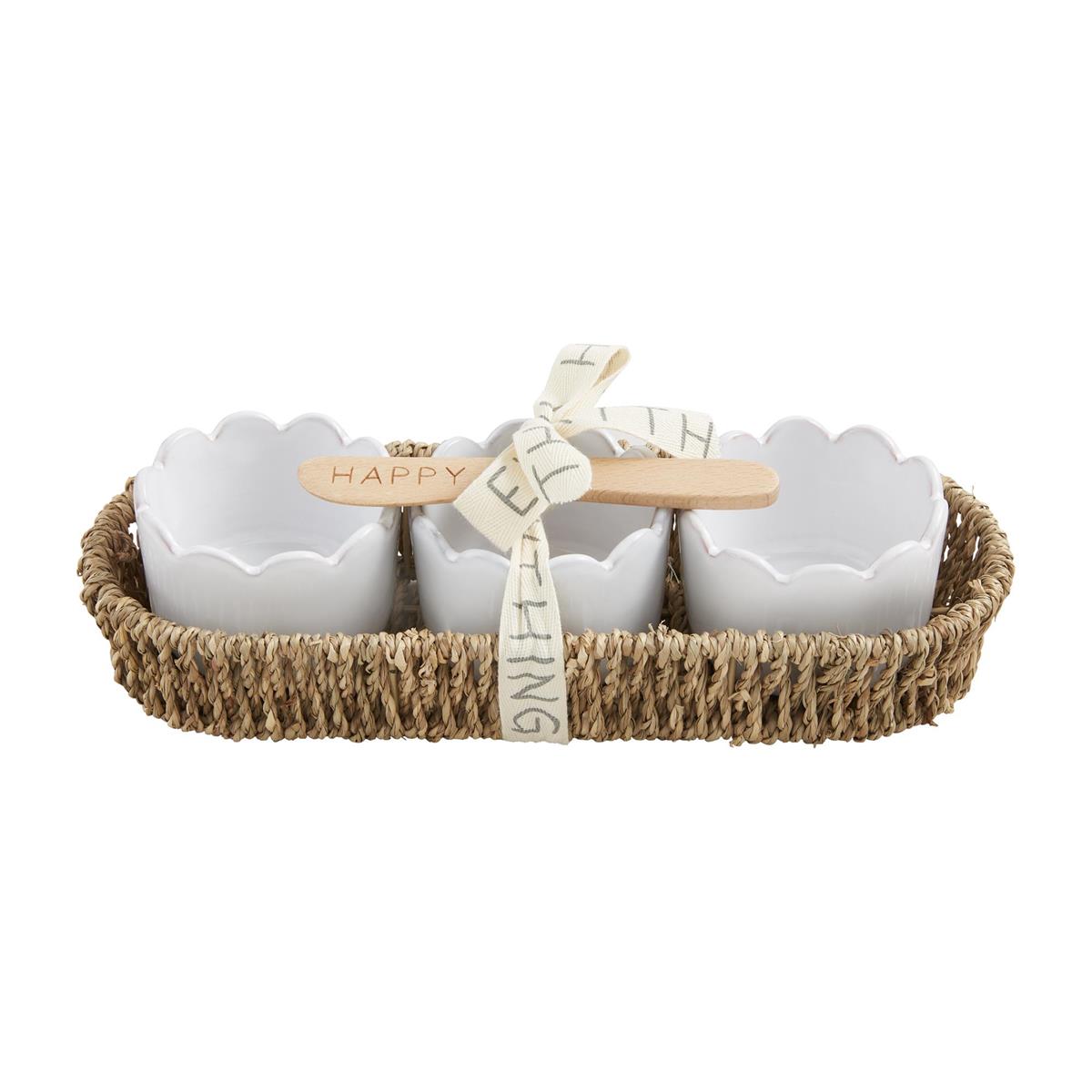 - Includes 3 glazed scallop terracotta tidbit dishes and a wooden spreader