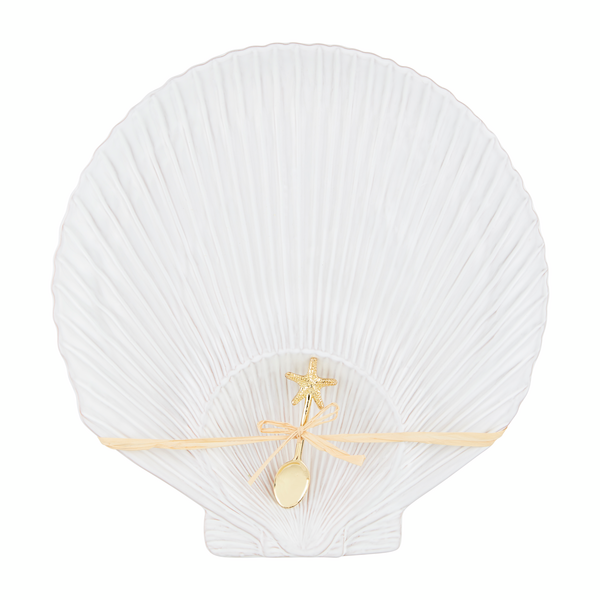 The Shell Chip And Dip Set is a beautifully crafted 2-piece ensemble designed to elevate your entertaining experience. This set features a milk-glazed terracotta chip server, artfully shaped like a fan shell, providing a unique and elegant presentation for your favorite snacks. The integral dip cup is seamlessly incorporated into the design, ensuring convenience and style. Accompanying the server is a gold-finished stainless steel starfish spoon, adding a touch of coastal charm to your table setting. The server measures 12 3/4 inches by 13 inches, while the spoon is 4 inches long, making this set both functional and aesthetically pleasing. Perfect for any occasion, this stoneware set is sure to impress your guests.