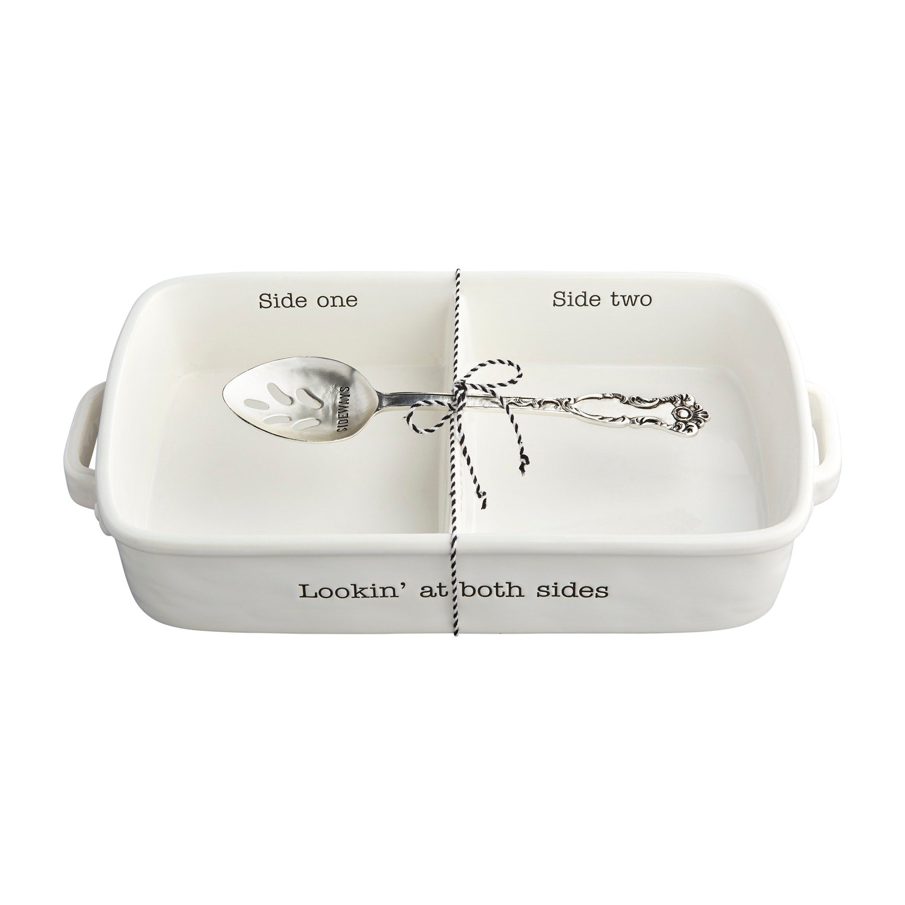 Side one or side two? Serve your favorite sides with our side dish serving set. The two piece set comes with a sectioned ceramic dish comes with slotted silver-plate spoon. The front of the dish reads "Lookin' at both sides". The inside reads "Side one" on one side and "Side two" on the other. The spoon reads "sideways". Crazing is a natural feature of ceramics that occurs over time, if your item begins to craze, don't worry! This item is still food safe. We do not recommend taking a baker straight from the refrigerator to the oven or vice versa.