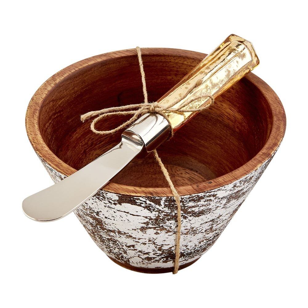 Say hello to your new favorite dip bowl, our silver wood dip bowl set. The two piece set comes with a foiled mango wood dip bowl. The dip bowl features a silver metallic distressed finish and unique markings. The dip bowl comes with a coordinating mercury glass spreader.