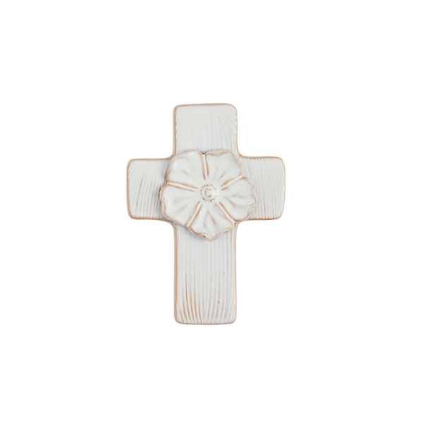 Small Ceramic Flower Cross. This exquisite piece features a beautifully textured stoneware cross adorned with an intricately sculpted floral surface, adding a touch of elegance and charm to any space. The cross is designed with a convenient back wire hanger, making it easy to display on walls. Measuring 5 1/2" x 3 3/4", this decorative item is crafted from high-quality stoneware, ensuring durability and a timeless appeal. Perfect for enhancing your home decor or as a thoughtful gift for loved ones.