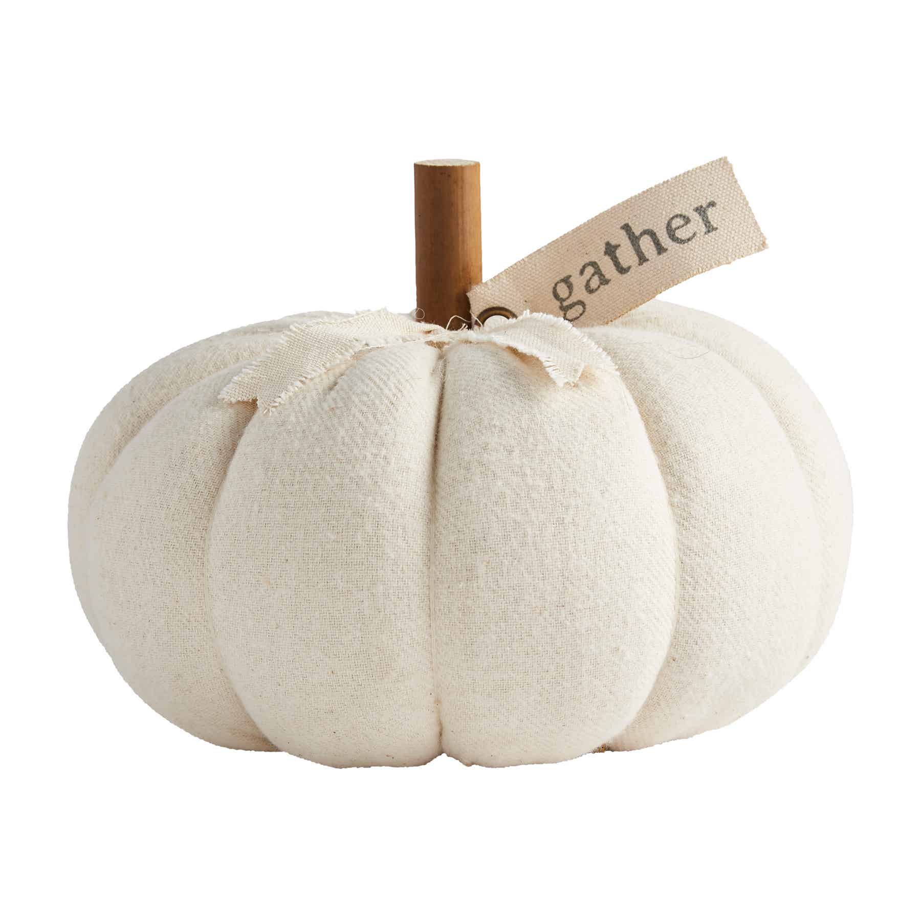 Gather people into your home with our small white pumpkins. The stuffed cotton pumpkin has a wood stem and canvas tag. The pumpkin features a classic white coloring, perfect for all season. The pumpkin also features a tag that hangs from the stem and features the sentiment "gather" on it.