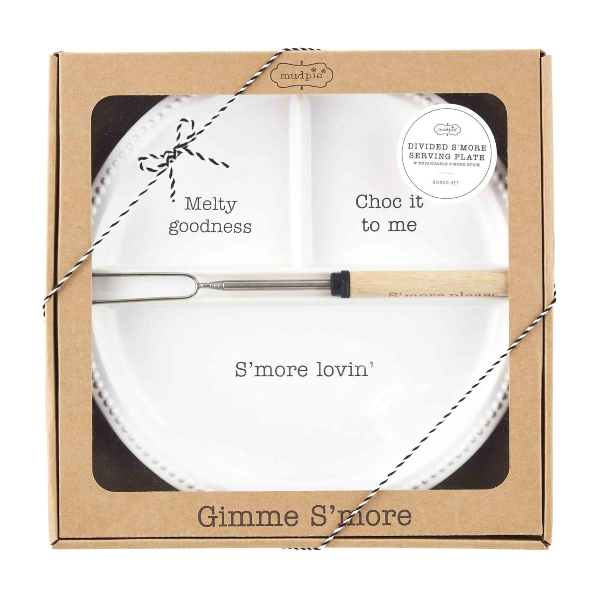 2-piece set. Beaded ceramic divided s'mores plate. Center groove holds included expanding skewer. Gift box includes s'mores bar recipe.