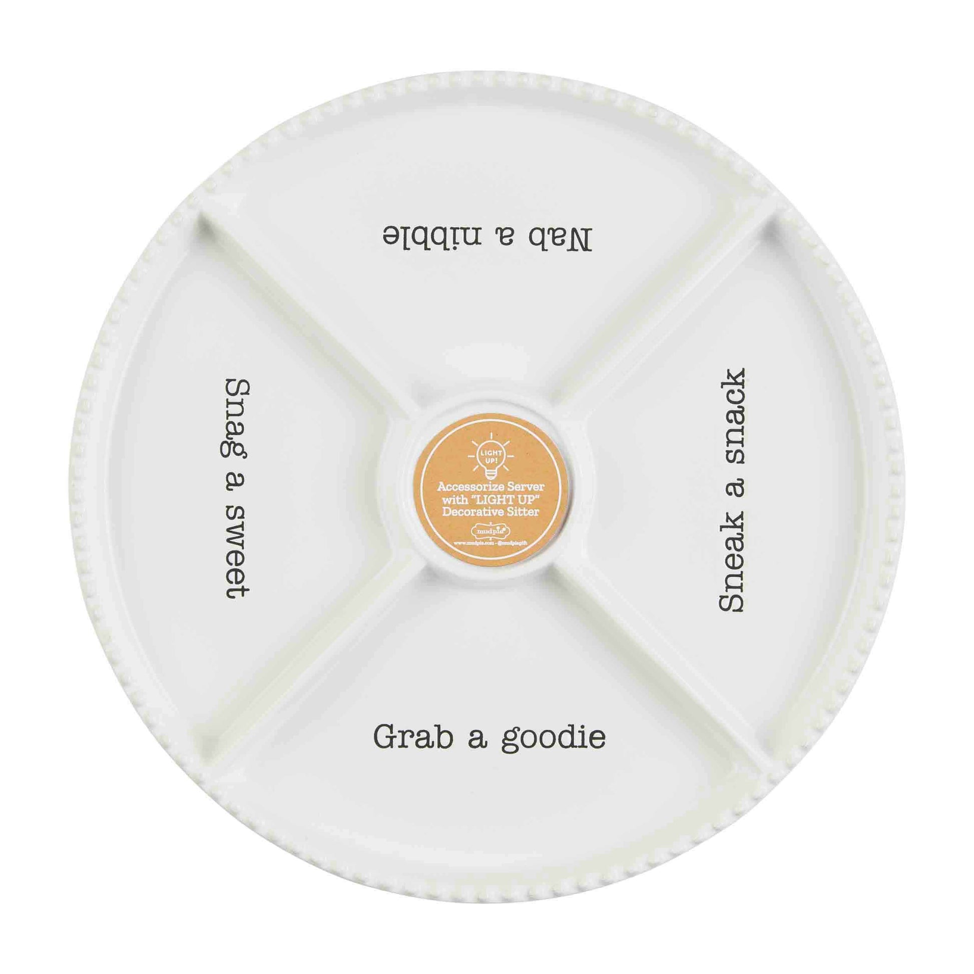Our Divided Serving Tray is the perfect companion for your snacking needs. Crafted from high-quality ceramic, this tray features four convenient sections, each adorned with a unique sentiment. With phrases like "Nab a nibble," "Sneak a snack," "Grab a goodie," and "Snag a sweet," you'll always find the perfect spot for your favorite treats. Made from durable dolomite, this tray measures 12 1/4" in diameter and is dishwasher safe for easy cleanup. For an added touch of charm, consider pairing it with our Mud Pie Decorative Sitter in the center. Elevate your snacking experience with our versatile and stylish Divided Serving Tray.