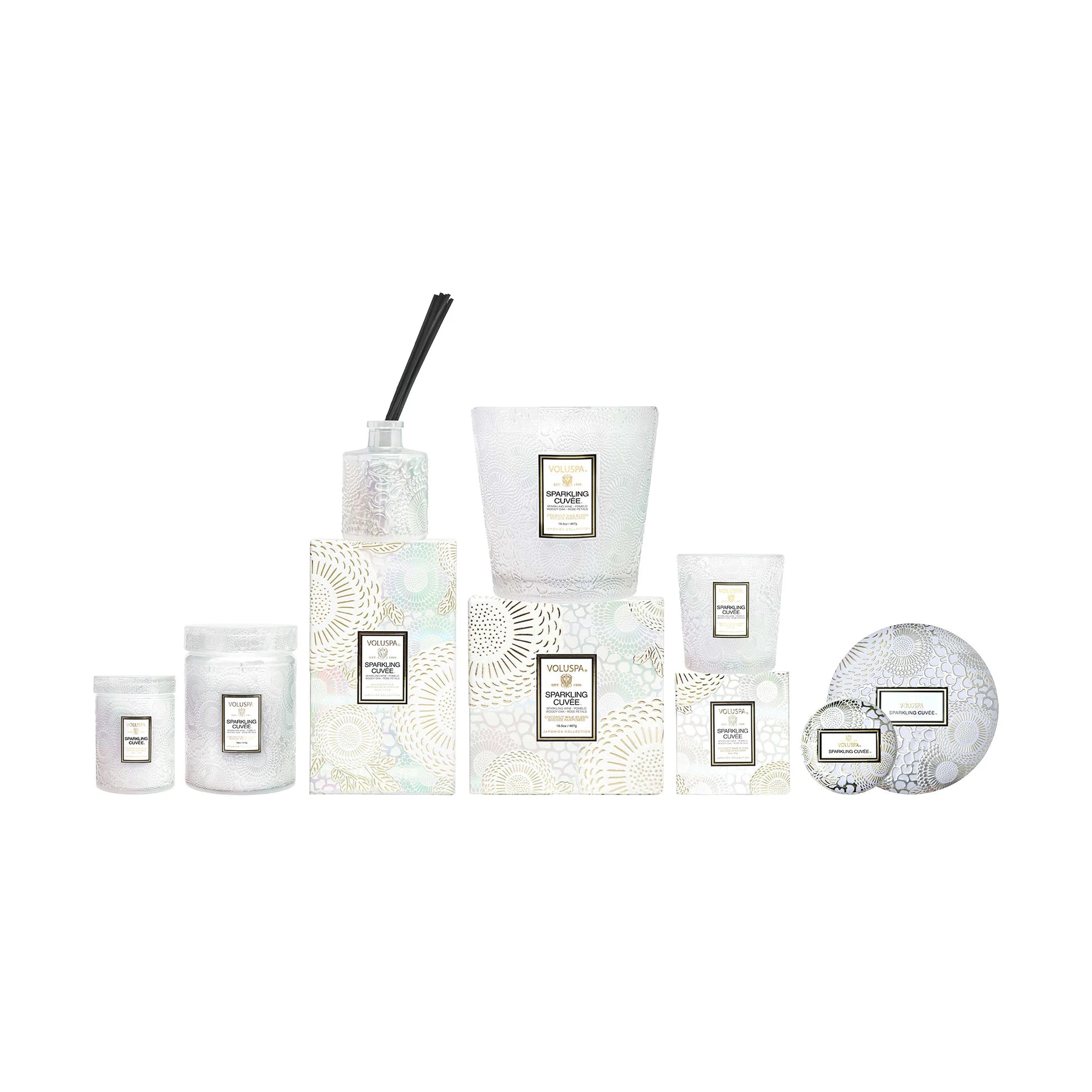 Pop a bottle of Voluspa’s finest blend, it’s time to celebrate! A mix of beautiful aromatic complexity, Sparkling Cuvée opens with vivacious fruit tones of Sparkling Wine, Pomelo and Red Currant. The effervescence of Sparkling Wine is the heart of the celebration, with bubbles cascading to the surface, dancing and mingling with juicy Nectarine and Bulgarian Rose Petals. A velvety, smooth finish of Woody Oak serves as the perfect stage for this aromatic affair. Raise a glass of Sparkling Cuvée, your olfactory aperitif for every unforgettable occasion.
