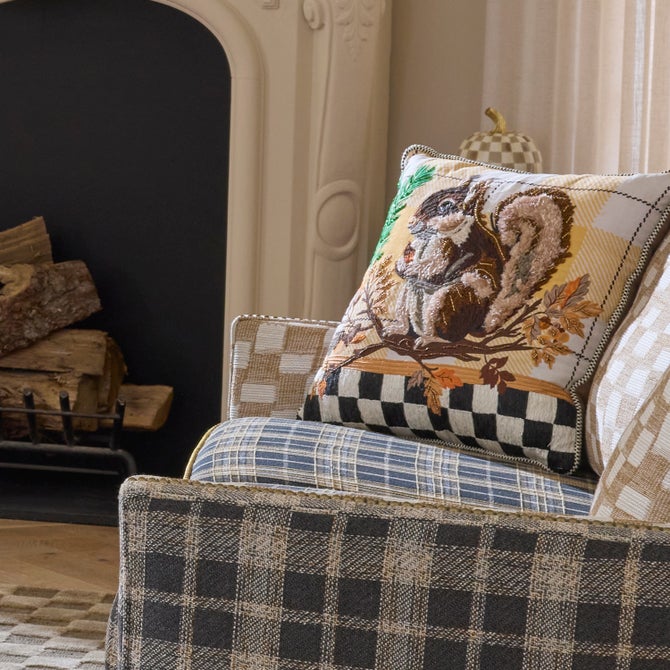 Celebrate a season of style on the sofa or armchair with this charming throw pillow. Features a chipper squirrel perched atop an autumn branch layered atop black and white checks, and is embellished with detailed beading.