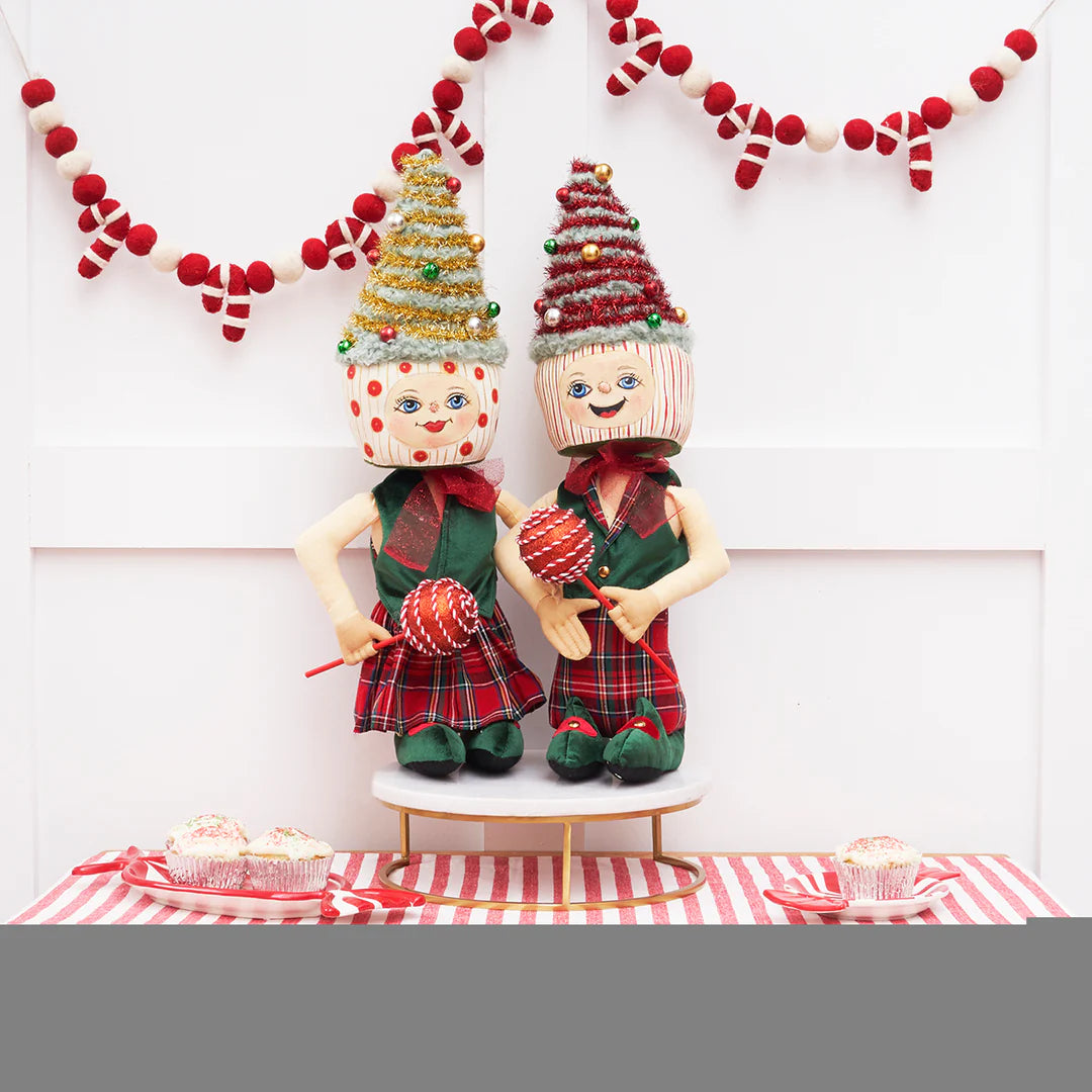 Meet Tabitha Tree, a whimsical figure that celebrates the beauty of the Christmas season! Dressed in a lush green and red plaid outfit, this 20-inch-tall art doll is adorned with a tree on top of her head adorned with sparkling ornaments and garland. Tabitha radiates holiday cheer and her enchanting presence adds a touch of magic to any festive decor.