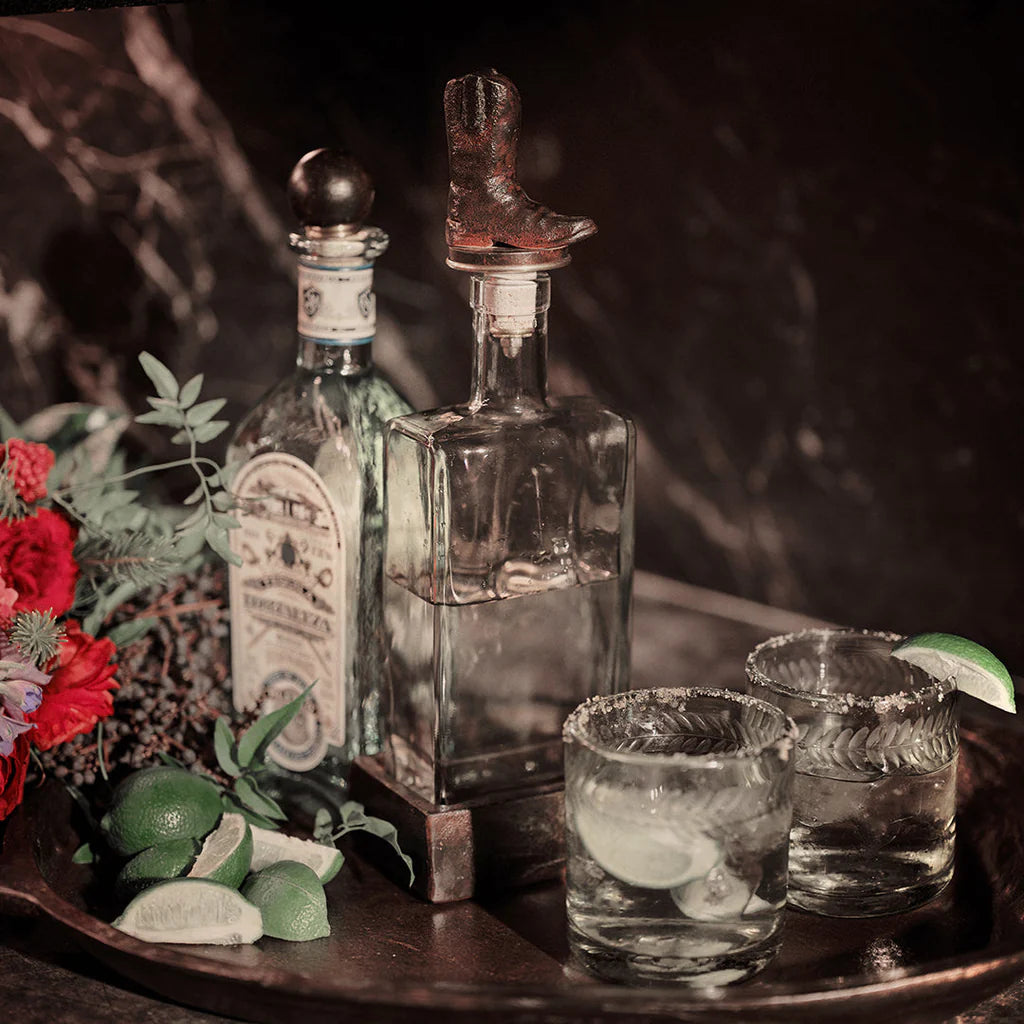 Cowboy boot wax cast iron decanter topper with slender glass bottle and thick cast iron coaster