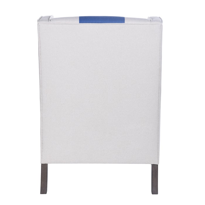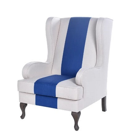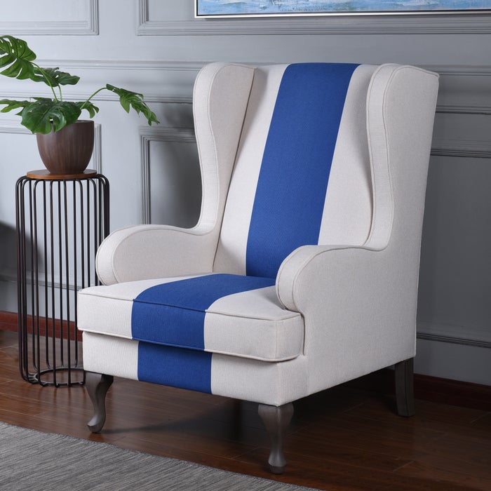 White Accent Chair with Blue Stripe and Wooden Cabriole Legs