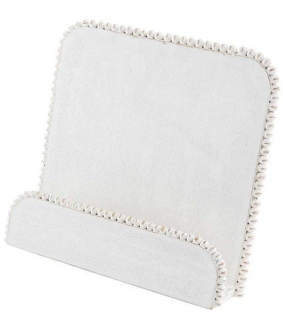 White-washed mango wood cookbook holder features beaded trim. Stands with back easel.