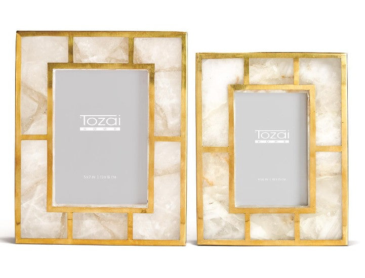 These Contemporary solid stone quartz frames are highlighted and accented with fretwork in a brass metal. The neutrality allows the frames to be placed in just about any home.